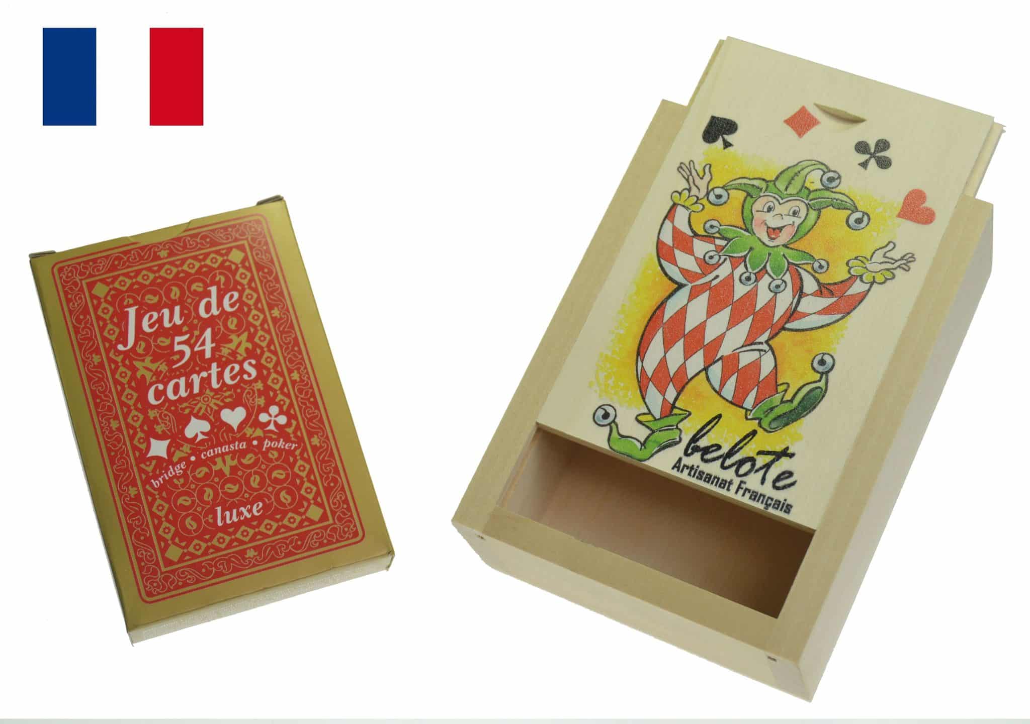 Boite à cartes en tilleul non vernis décorée + jeu de 54 cartes 80 x 110 Hauteur 35 mm Décor joker