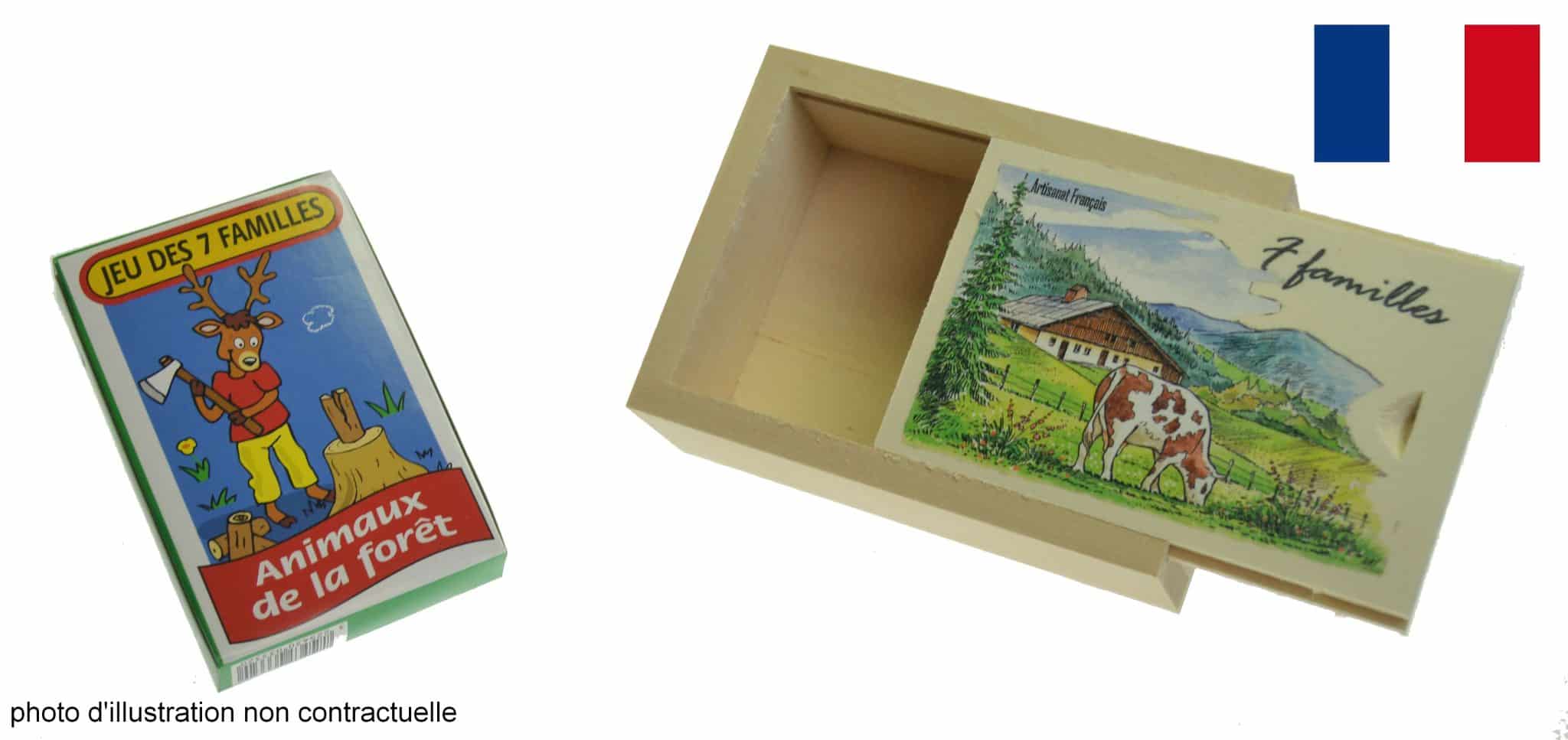 boîte de 7 familles en tilleul non vernis décorée + jeu des 7 familles assortis 80 x 110 Hauteur 35 mm décor Montagne 1