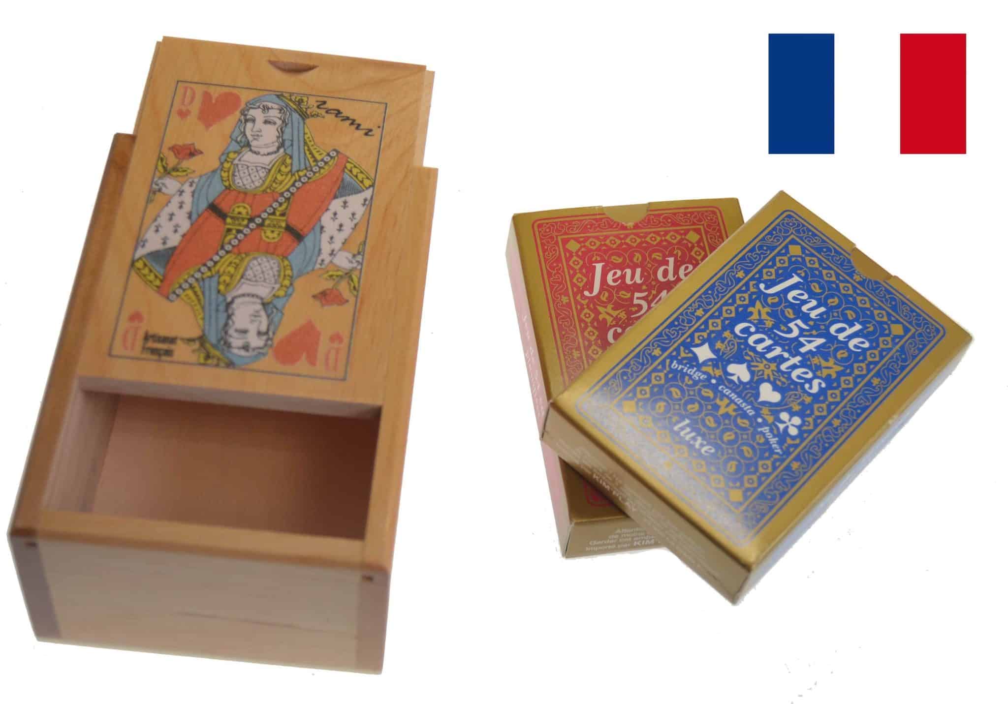 boîte de rami en aulne décoré avec 2 jeux de 54 cartes(1 bleu & 1 rouge), 10.5 x 7.4 x 4.9 cm modèle “D”