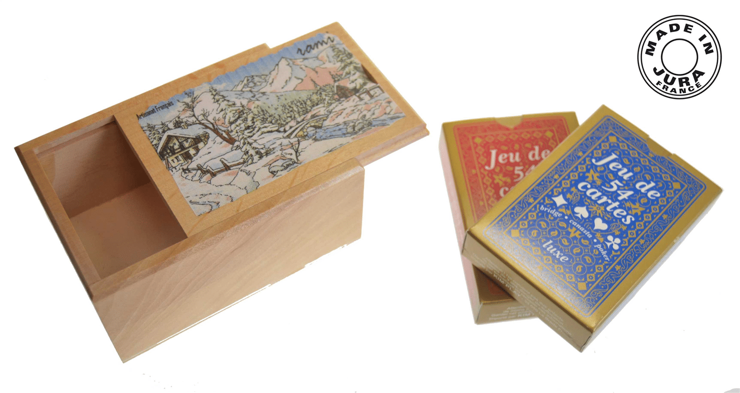 boîte de rami en aulne décoré avec 2 jeux de 54 cartes(1 bleu & 1 rouge), 10.5 x 7.4 x 4.9 cm modèle “N6”