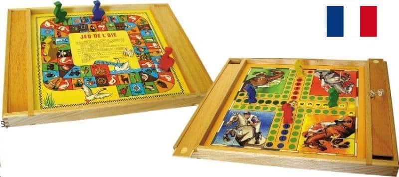 Coffret Jeux de société à tiroir oie et petits chevaux en hêtre vernis massif vendu avec 8 petits chevaux en buis et 4 oies en bois 33 x 33 x 4.5 cm 42 x 33 x 4 cm
