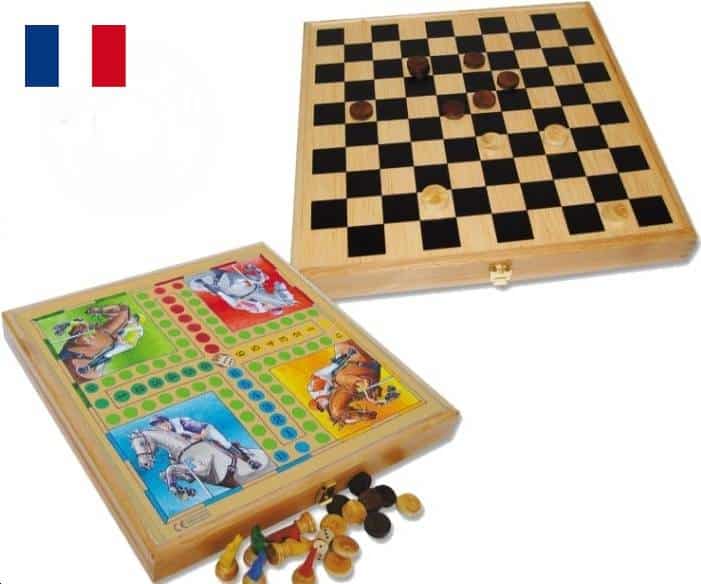 Coffret jeu de société 4 jeux : dada, oie, dames et jacquet, pions buis diamètre 22 mm 8 petits chevaux buis ht 44 mm, 2 dés 16 mm et un jeu de dames case 30mm avec règles des jeux, 33 x 33 x 4.5 cm