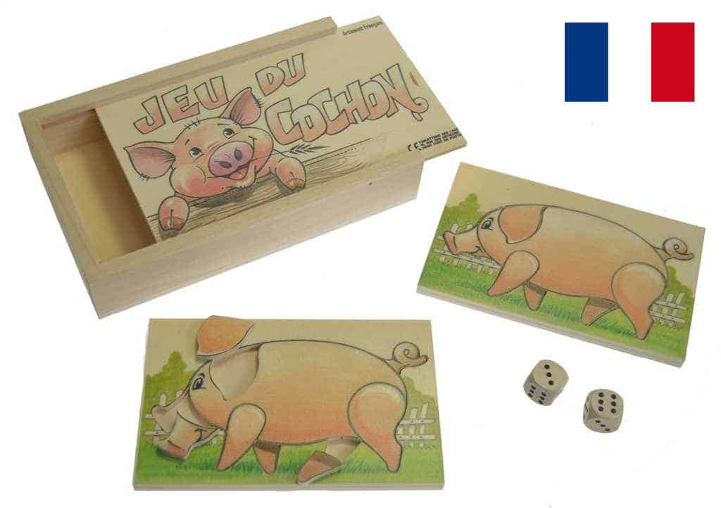 Jeux du cochon en tilleul boite 180 x 112 Ht 36 mm avec 2 plateaux de jeu en contre plaque peuplier 138 x 86 mm et 2 dés de 16 mm livré avec ça règle du jeu